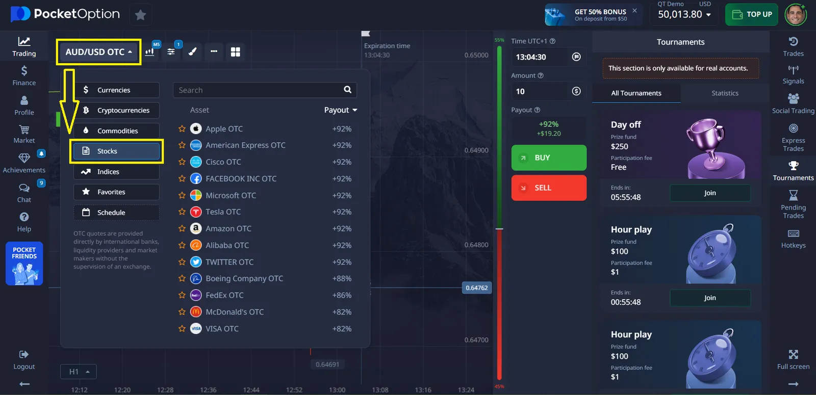 Pocket Option offers a free demo account with $50,000 in virtual funds that allows users to practice trading without financial risk. The demo environment reflects many features of the real trading platform, having a similar interface. With a demo account you can familiarize yourself with the platform, practice your trades, work with indicators and safely prepare for real trading.