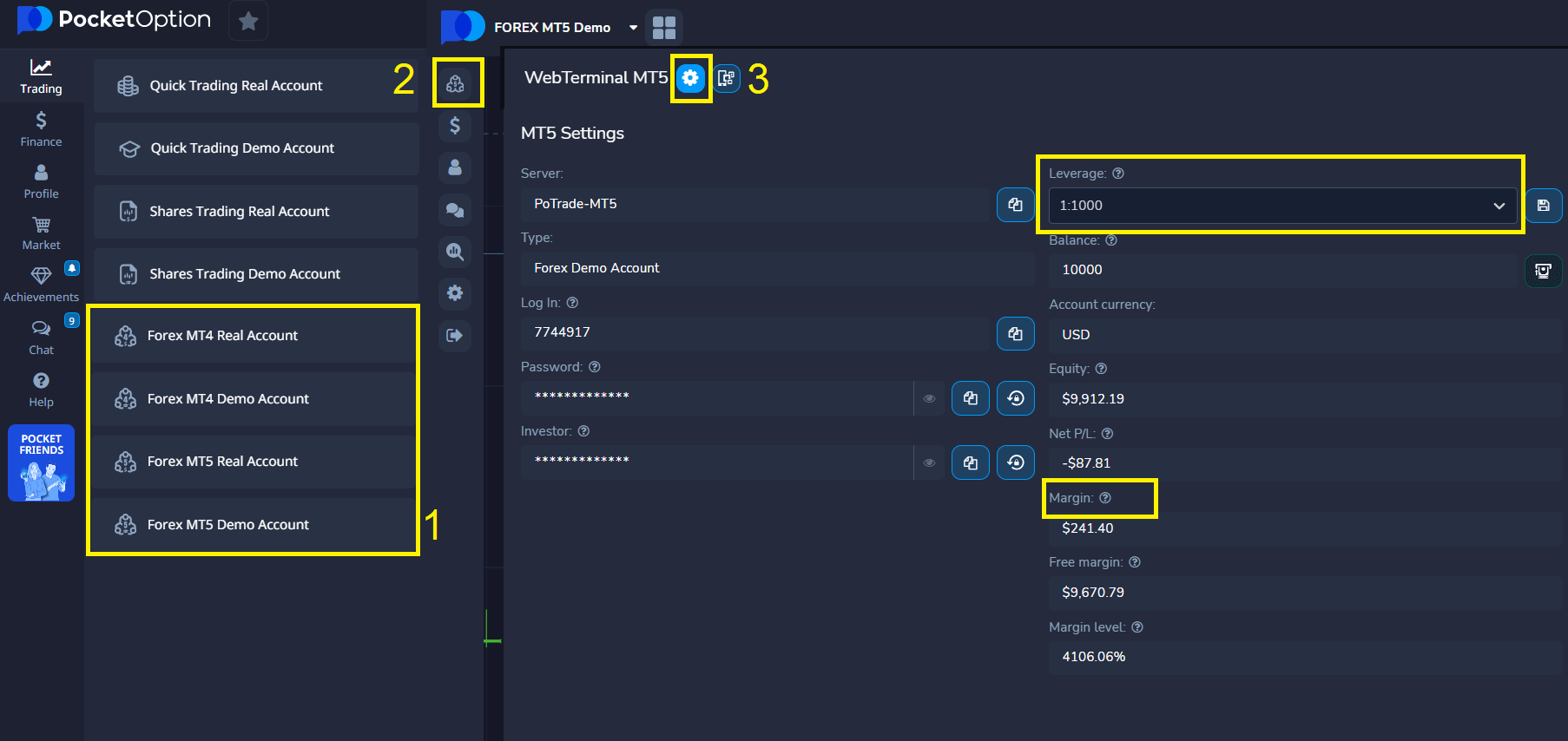 - Log In: Use your Pocket Option MT5 credentials to access the terminal.