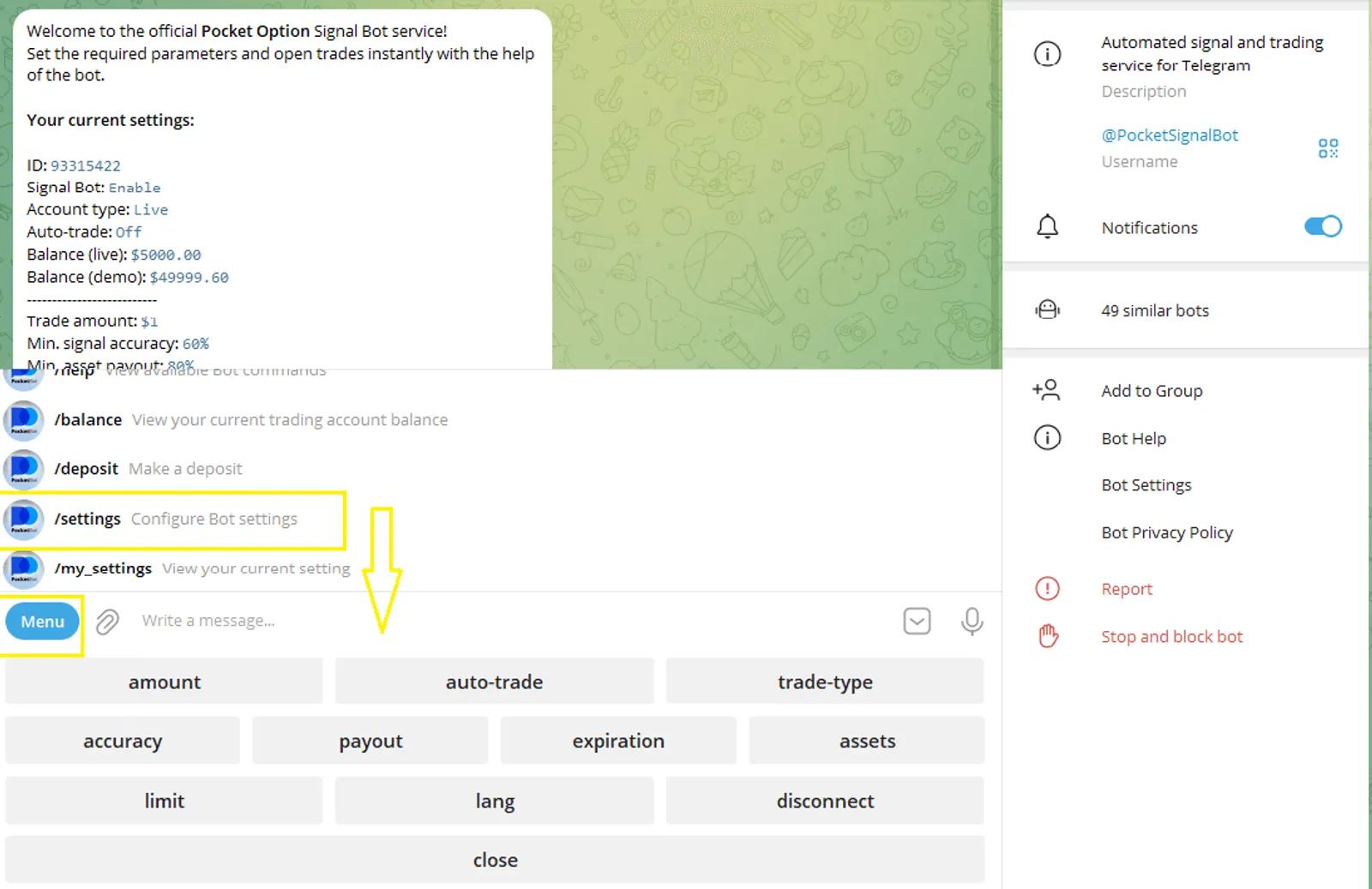 In addition to manual signals, Pocket Option also offers a Telegram Bot to receive and act on signals for commodities. This bot can send signals either automatically or manually, allowing you to customize it based on your preferences for a more personalized trading experience.