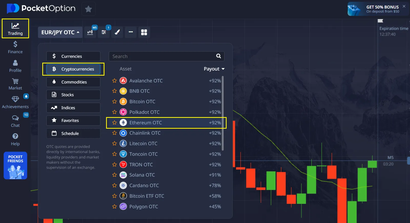 Pocket Option is a user-friendly platform for trading Ethereum and other assets. You can easily start trading by selecting Ethereum from the asset list and using various platform features such as express trading and technical analysis.