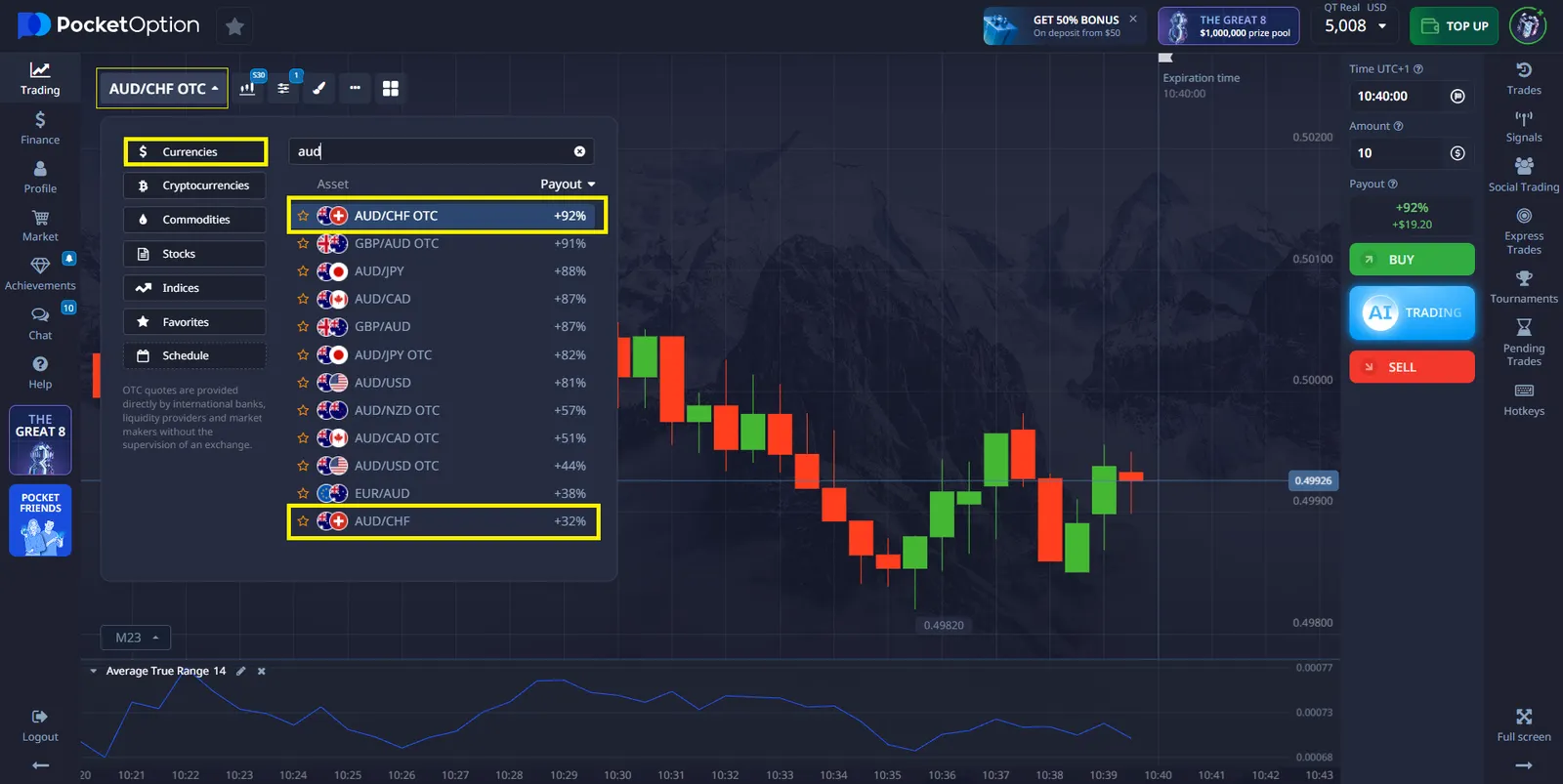 - Open the Pocket Option platform and find the currency pair AUD/CHF or AUD/CHF OTC (outside regular trading hours).