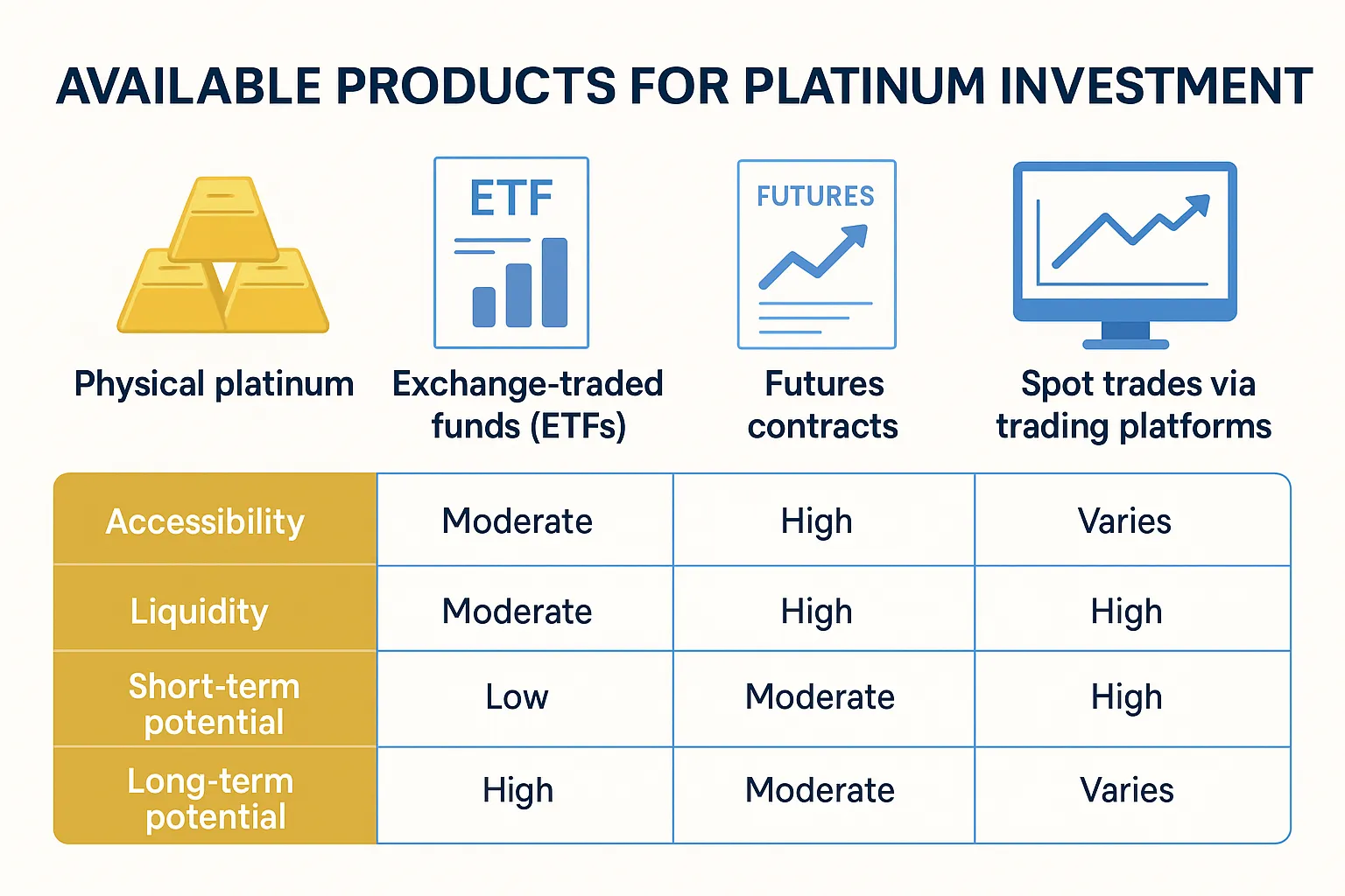 Investors can choose from several platinum investment products, each suited for different goals and risk profiles: