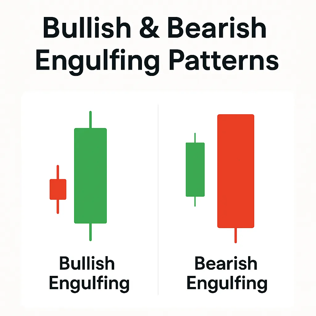 Bullish Engulfing forms after a downtrend: a small red candle is completely engulfed by a large green candle. Bearish Engulfing forms after an uptrend: a small green candle is completely engulfed by a large red candle.