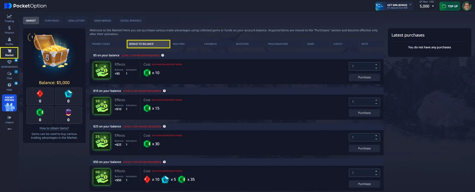 - Use gems to buy: If you have earned enough crystals (gems) through trading activities or achievements, you can use them to buy the selected bonus. If you do not have enough, you can earn more by becoming an active trader, participating in the gem lottery, or buying crystals directly from the market.