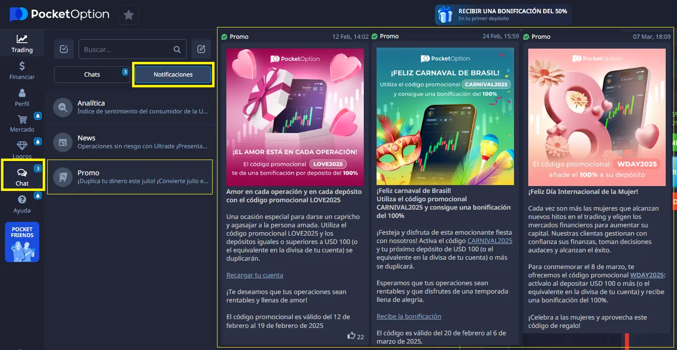 Pocket Option ofrece un bono de depósito del 50% para sus nuevos clientes mexicanos que cumplan con los requisitos de la CNBV para inversiones en línea.