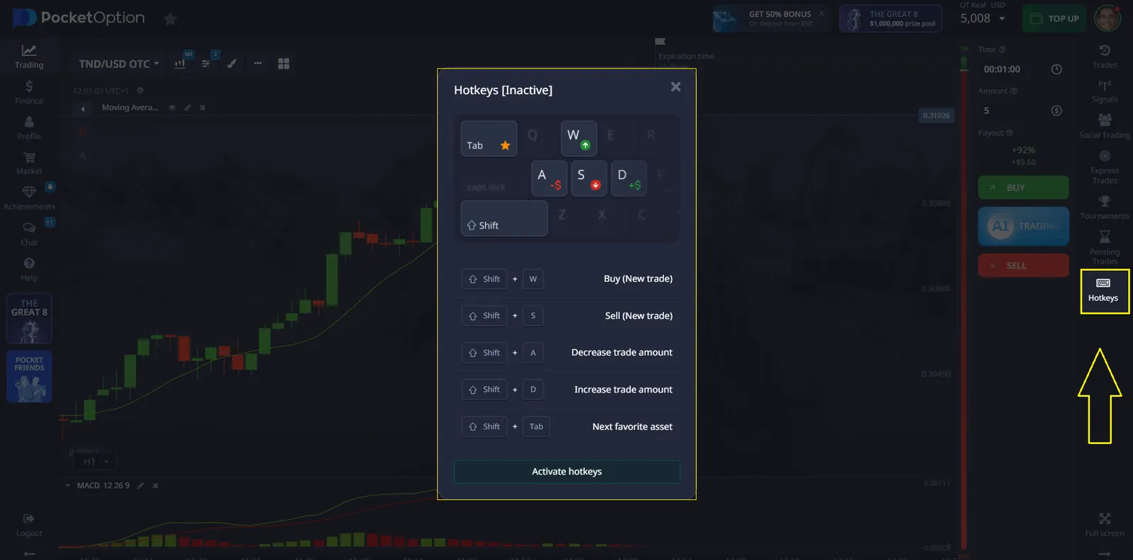 Una configuración optimizada de tu teclado para el trading intradía puede reducir el tiempo de ejecución entre un 40 % y un 60 %. Por ejemplo, Pocket Option permite a los traders crear atajos personalizados, haciendo que el trading sea más rápido y eficiente.