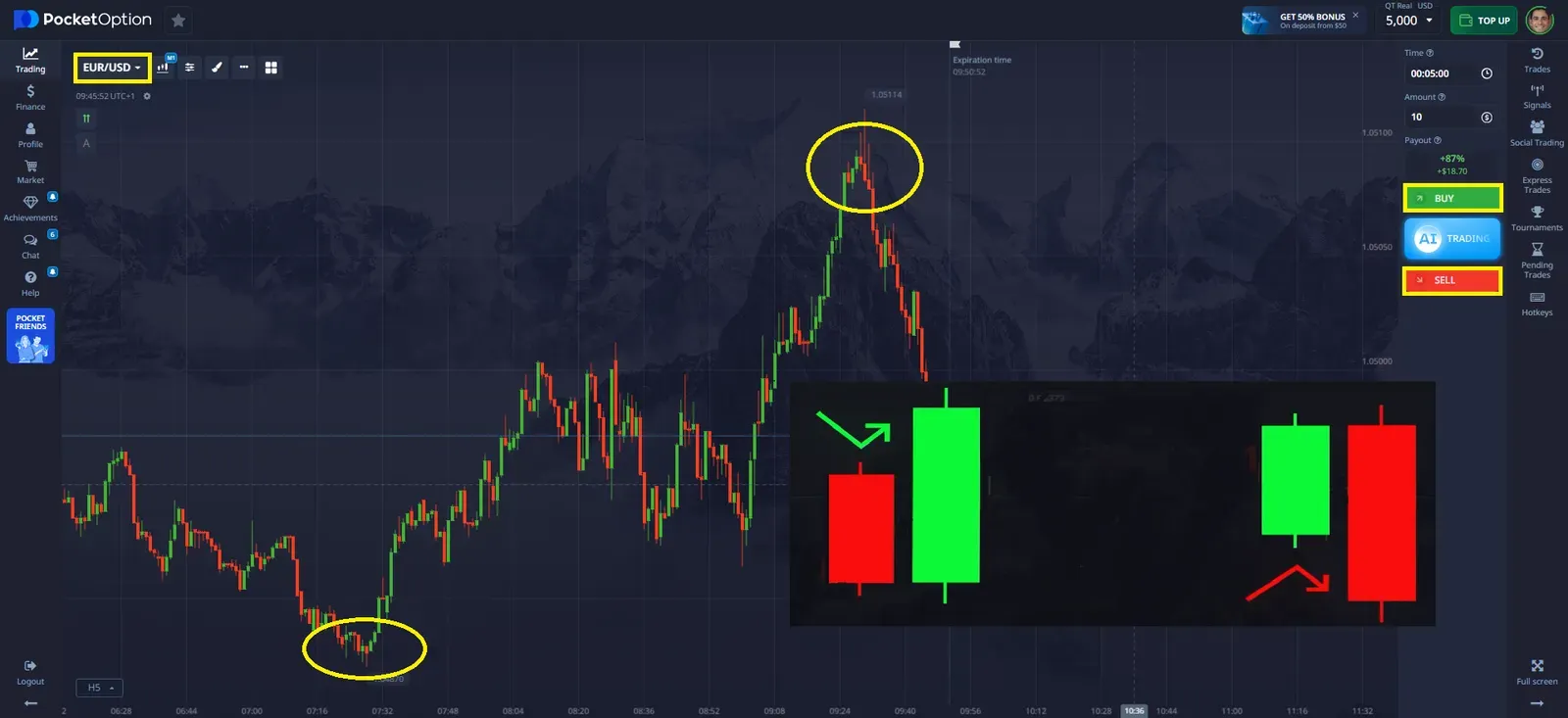 Cada estrategia de trading requiere una comprensión clara y una aplicación adecuada. A continuación se presentan ejemplos detallados paso a paso del uso de métodos clave de trading en la plataforma Pocket Option.
