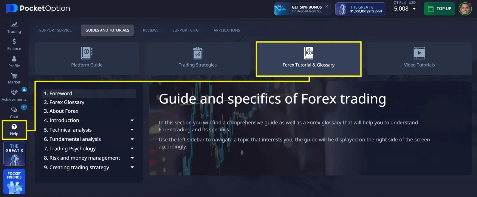 Pocket Option ofrece trading de forex sin problemas a través de su terminal de trading MT5 integrada, proporcionando a los operadores una plataforma potente pero fácil de usar para navegar en los mercados de divisas globales. Para aquellos que buscan mejorar sus habilidades de trading, la plataforma cuenta con una sección educativa dedicada que contiene materiales de aprendizaje completos y un glosario detallado de terminología forex.