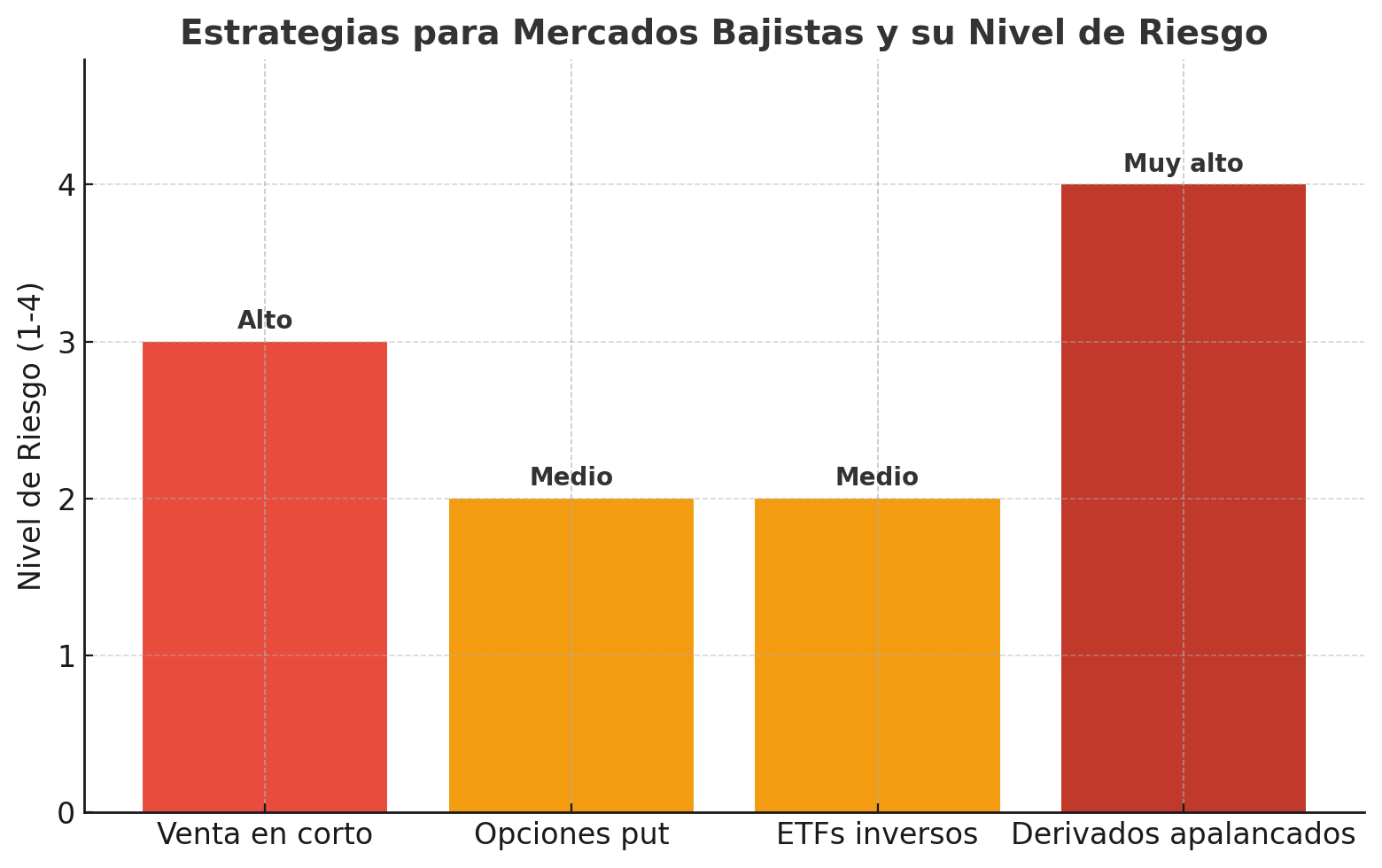 Se puede apostar contra el mercado vendiendo en corto, comprando opciones put o usando ETFs inversos que suben de valor cuando el índice baja.
