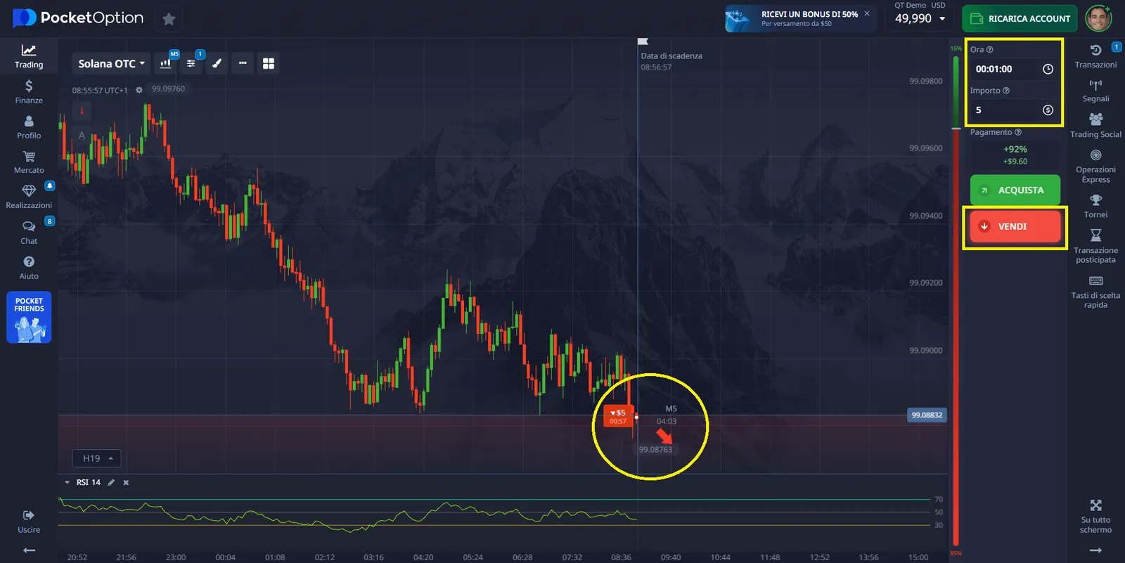 Ejemplo de trading con Solana (SOL) en Pocket Option