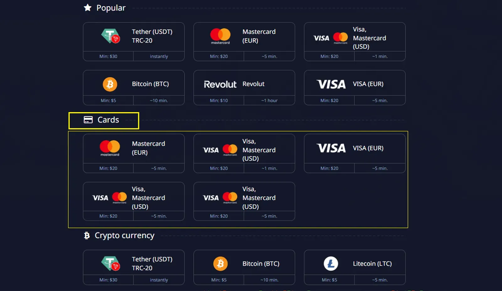 Sur la page de dépôt, localisez et choisissez l’option de paiement « Visa, Mastercard ».
