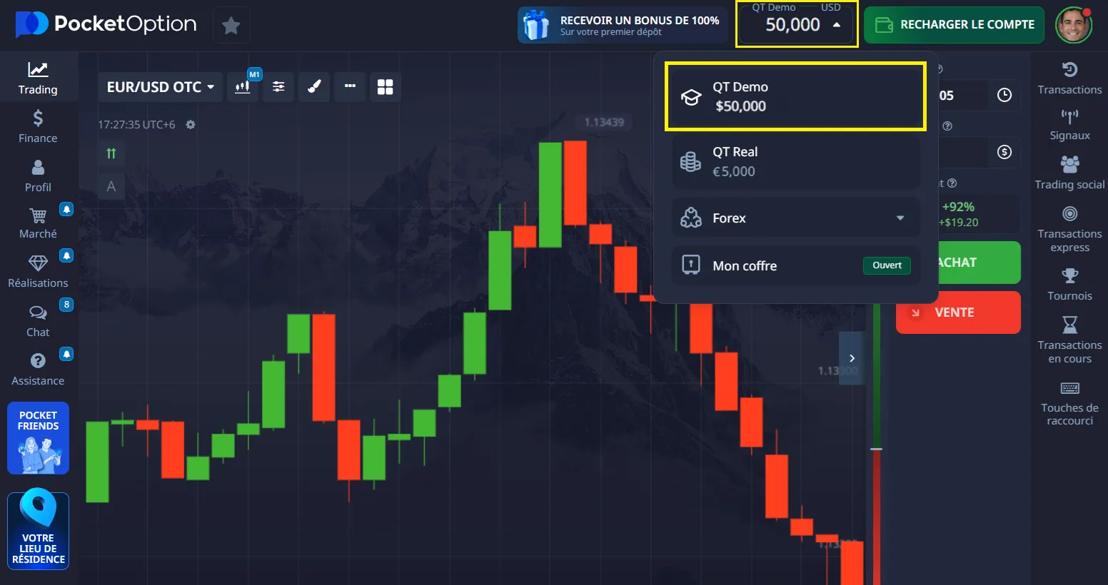 Pocket Option est une plateforme de trading simple et intuitive, idéale même pour les débutants. Profitez d'une interface claire, de ressources pratiques et d'un compte démo gratuit de 50 000 $ pour commencer en toute sécurité.
