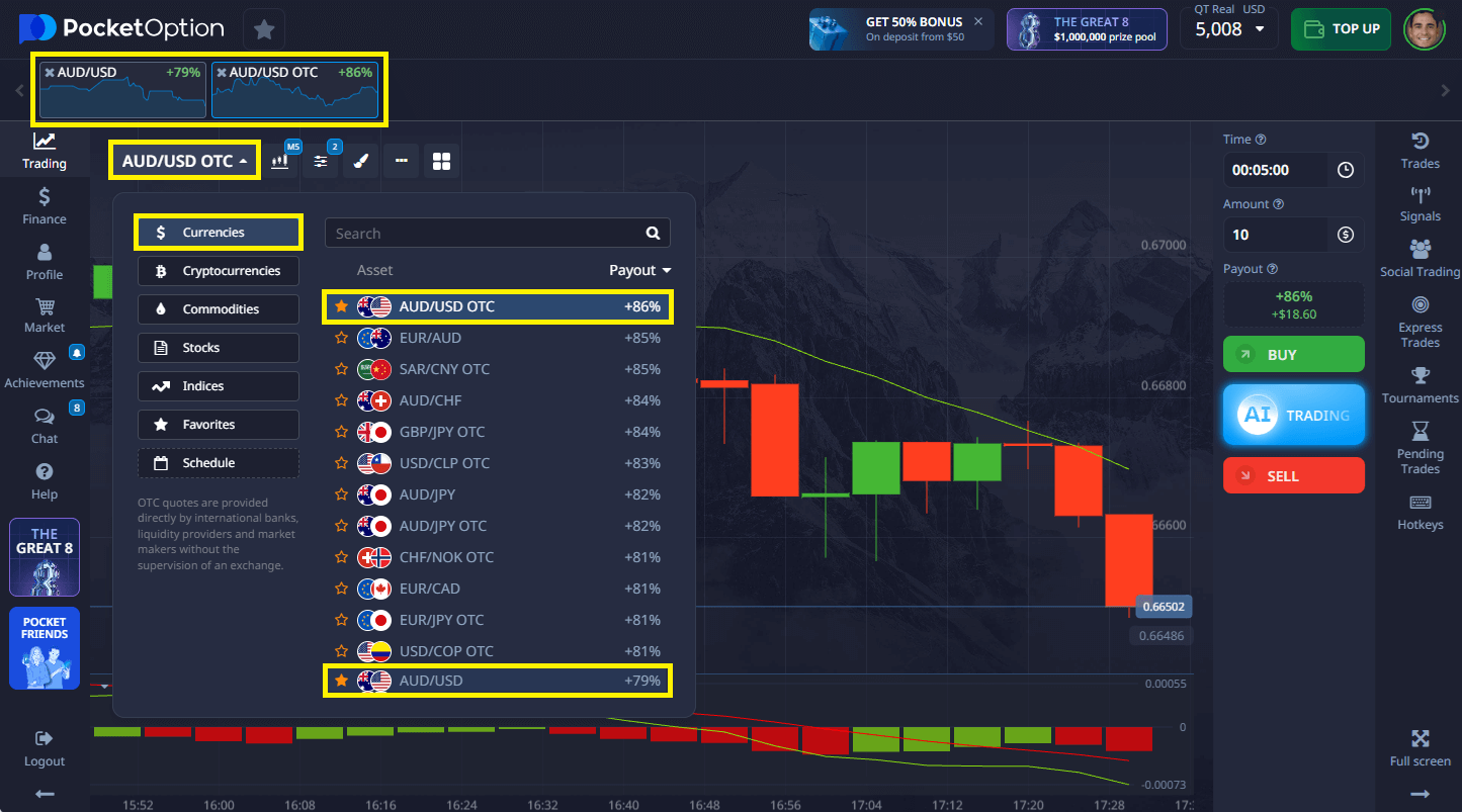 Trouvez AUD/USD ou AUD/USD OTC dans la liste des actifs, et utilisez le bouton ACHETER si vous pensez que le taux va augmenter.
