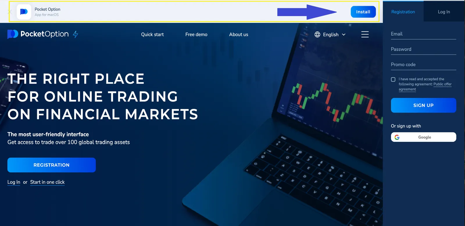 Quando scarichi l’app Pocket Option per PC, stai effettivamente scaricando un’applicazione web che si aprirà direttamente nel tuo browser. Non è necessario installare software o programmi speciali sul tuo computer, rendendo il processo rapido e semplice. Ecco come iniziare: