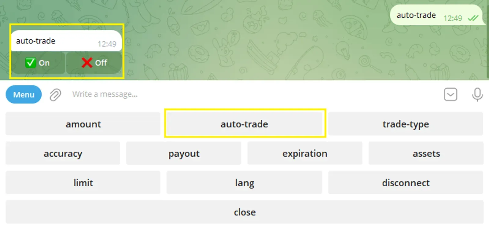 - Smetti di ricevere segnali: Per smettere di ricevere segnali, usa il comando /STOP in Telegram. Puoi anche attivare o disattivare il trading automatico in qualsiasi momento attraverso il menu /SETTINGS.