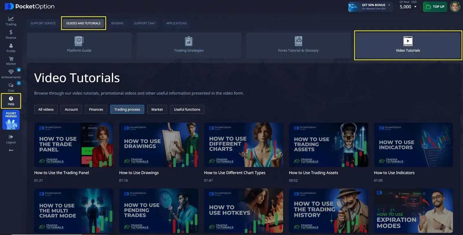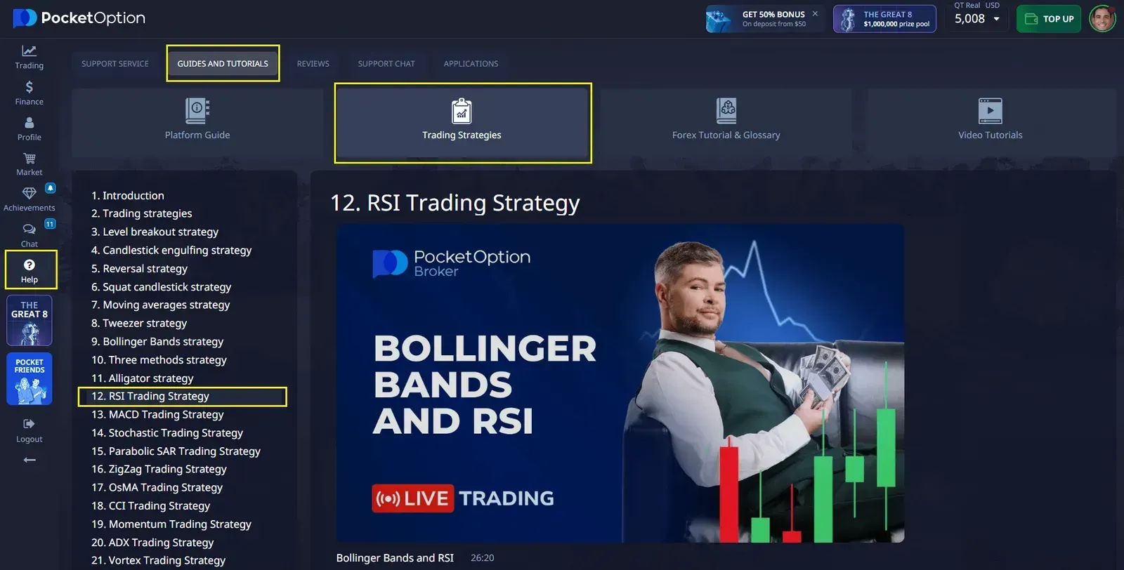 Per migliorare le tue prestazioni di trading, puoi esplorare varie strategie di trading disponibili nella sezione “Guide e Tutorial” su Pocket Option. Questa sezione offre una varietà di strategie, suggerimenti e tutorial per aiutarti ad analizzare il mercato finanziario e migliorare le tue abilità di trading.