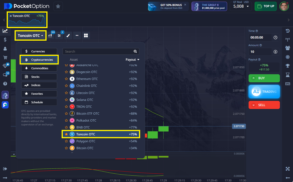 - Trova Toncoin nella lista degli asset di Pocket Option: cerca TON.