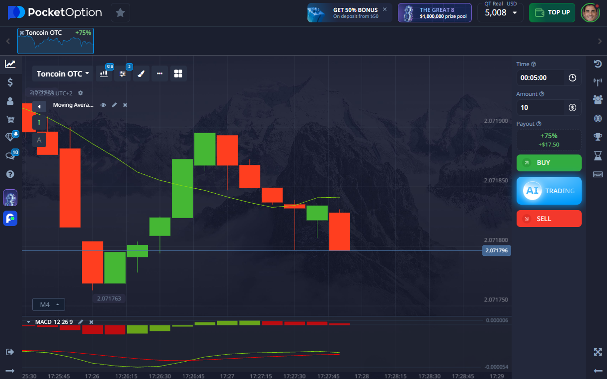 Se sei nuovo nel trading o stai testando una strategia, usa il conto demo da $50.000 di Pocket Option per simulare scambi di Toncoin senza rischio finanziario. Una volta pronto, puoi iniziare a fare trading live con appena $5.