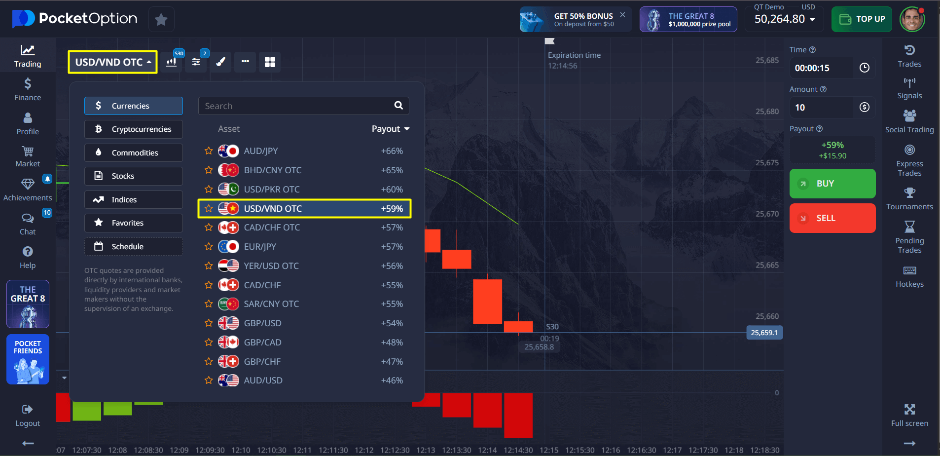 - Trovare l’asset: Naviga su “Coppie di valute” e seleziona “USD/VND OTC” dal menu degli asset