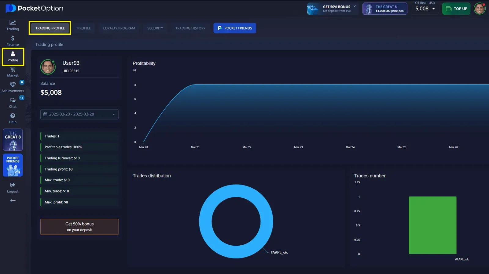 Pocket Option fornisce un pannello di controllo dove puoi monitorare i progressi del tuo turnover, specialmente se stai lavorando per soddisfare un requisito di prelievo. Vedrai una visualizzazione in tempo reale di quanto ancora devi operare. Puoi visualizzare il tuo turnover di trading nella sezione “Profilo di Trading”. Questa sezione fornisce statistiche dettagliate e informazioni sulla tua attività di trading.
