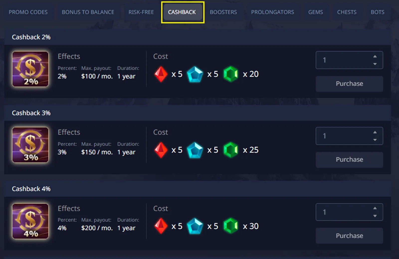 | Cashback 2%-10% | Otrzymaj cashback od 2% do 10% na przegrane transakcje. Ten bonus można kupić za kryształy i jest ważny przez rok. Cashback jest przyznawany, jeśli całkowita kwota strat jest większa niż zysk z poprzedniego miesiąca lub od dnia aktywacji. Po aktywacji jest automatycznie dodawany do Twojego salda pierwszego dnia każdego miesiąca. Aktywuj go na „Rynku” – „Zakupy”. Po aktywacji jest automatycznie dodawany do Twojego salda pierwszego dnia każdego miesiąca. |