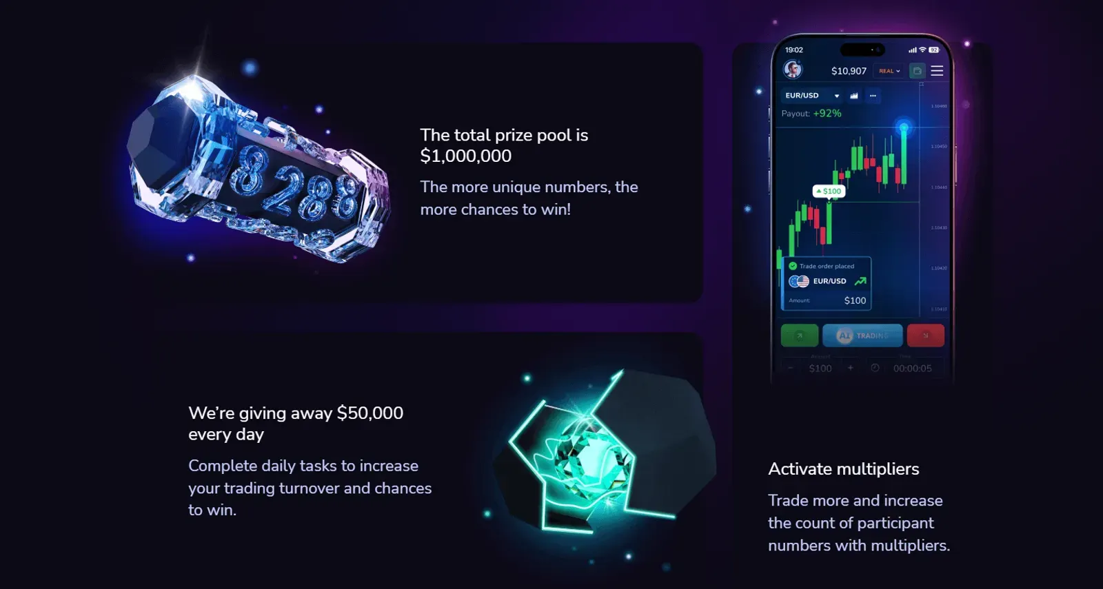 Gdy Twój obrót handlowy osiągnie $1 000, odblokowujesz mnożnik x2, co oznacza, że otrzymujesz 2 numery za każde $50 obrotu, zamiast tylko 1. Osiągnij $7 000 i otrzymaj 3 numery za każde $50 obrotu!