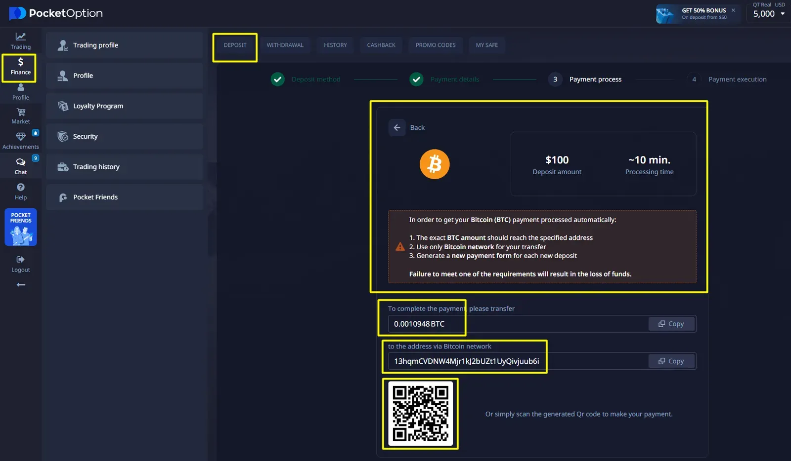 Dowiedz się krok po kroku, jak wpłacić Bitcoin na Pocket Option.