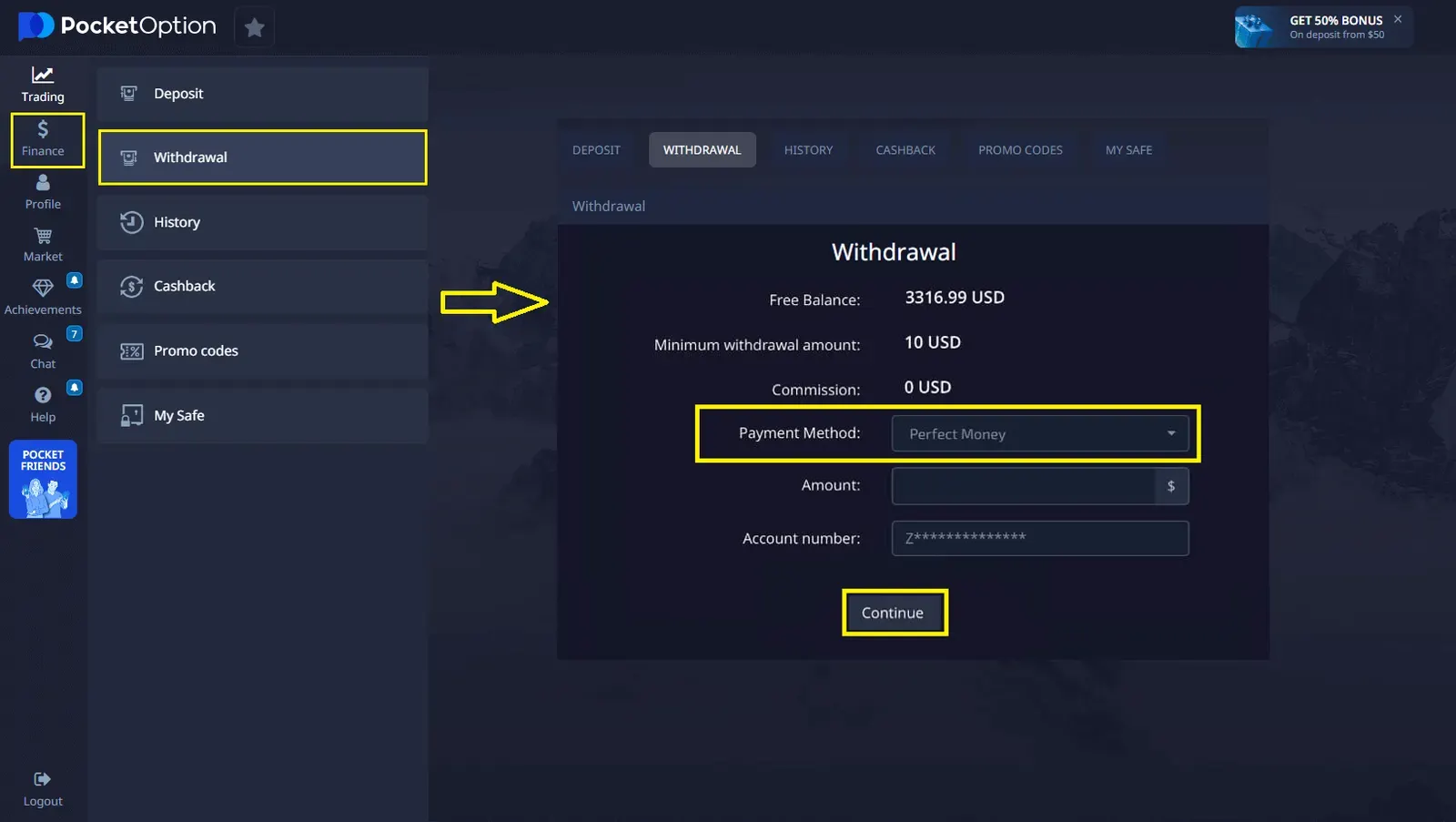 - Wybierz metodę wypłaty — Wybierz preferowaną metodę płatności i upewnij się, że kwota spełnia minimalną wypłatę Pocket Option.