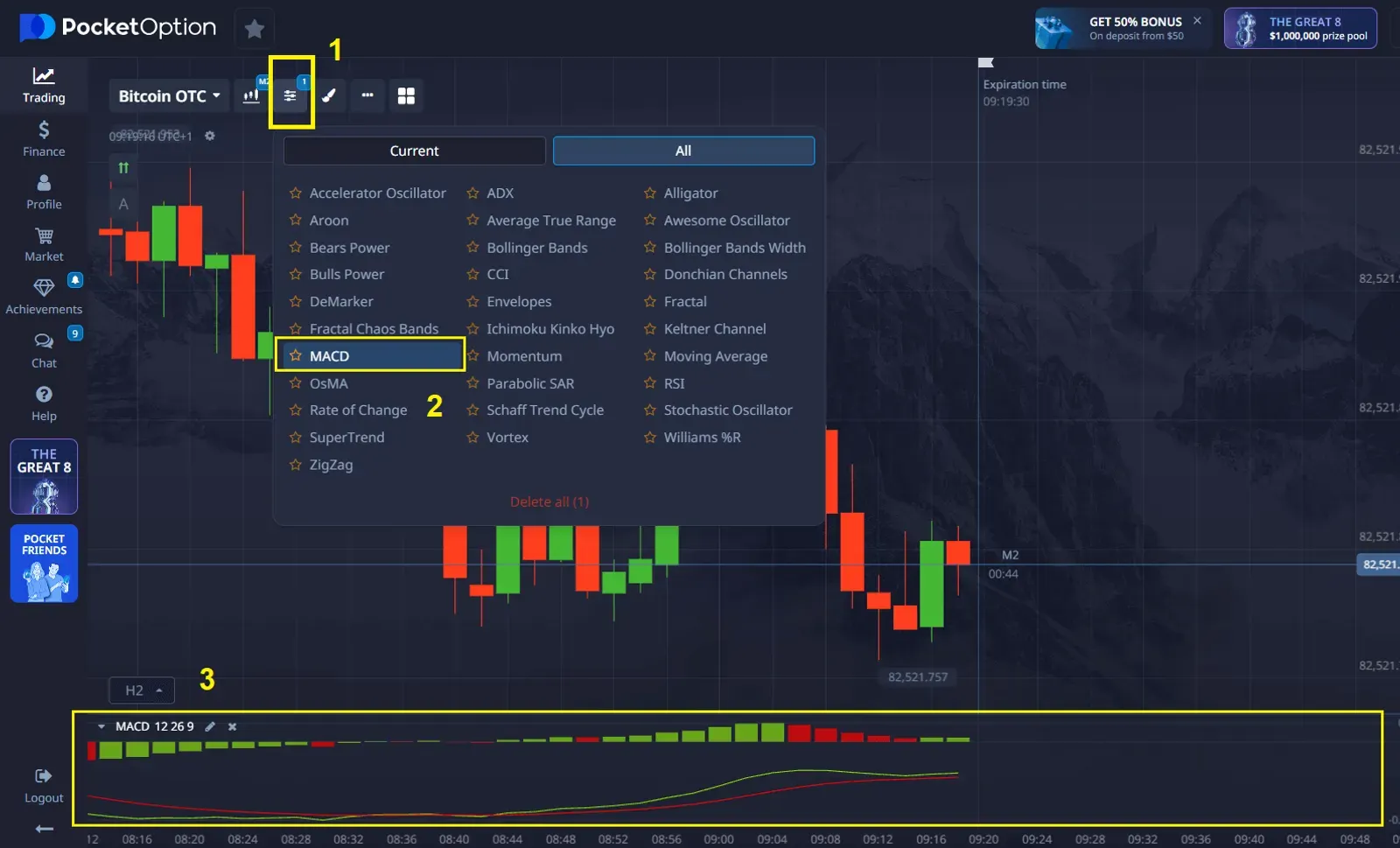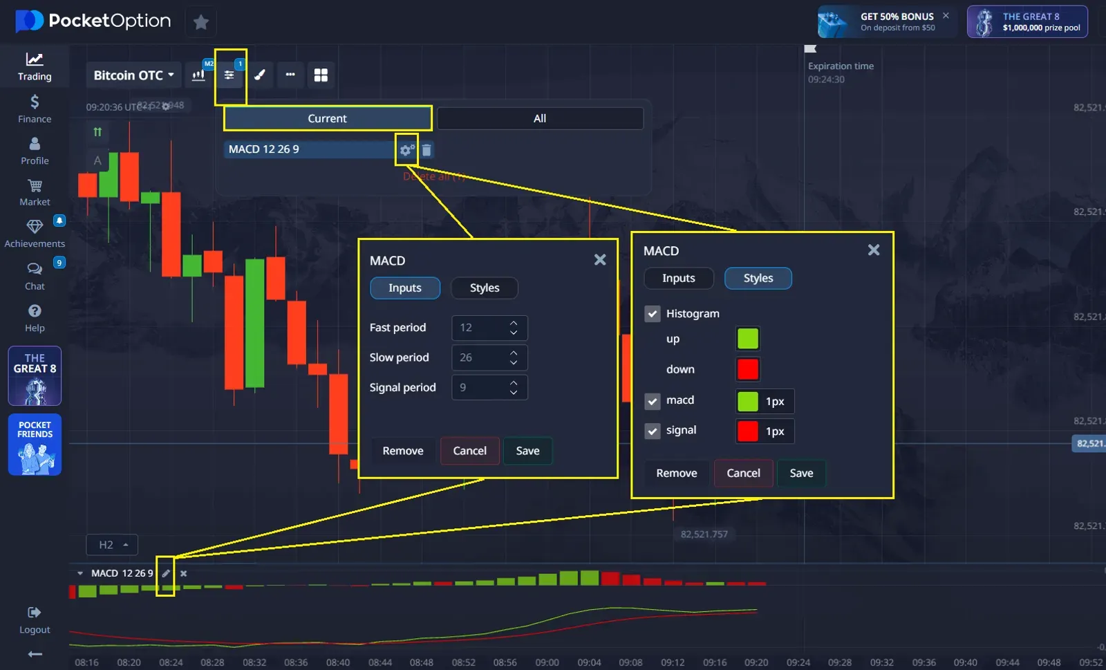 Jeśli korzystasz z platformy Pocket Option, dostosowywanie ustawień MACD jest proste i można to zrobić bezpośrednio w interfejsie wykresu: