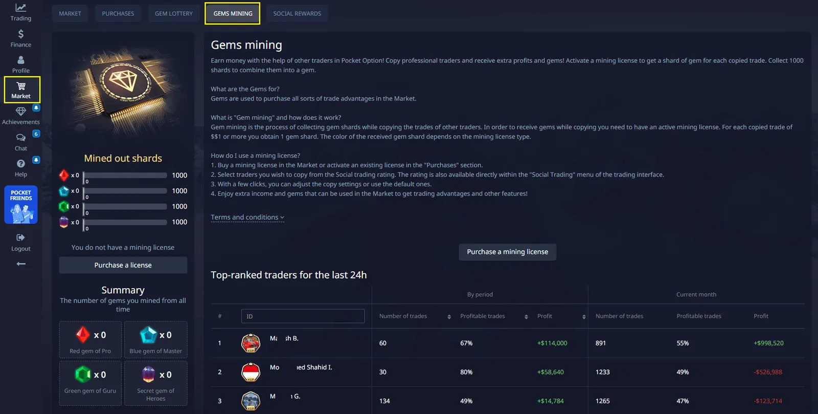 - Commencez le minage – achetez une licence sur le Marché et collectez des fragments de Gemme via le trading social.
