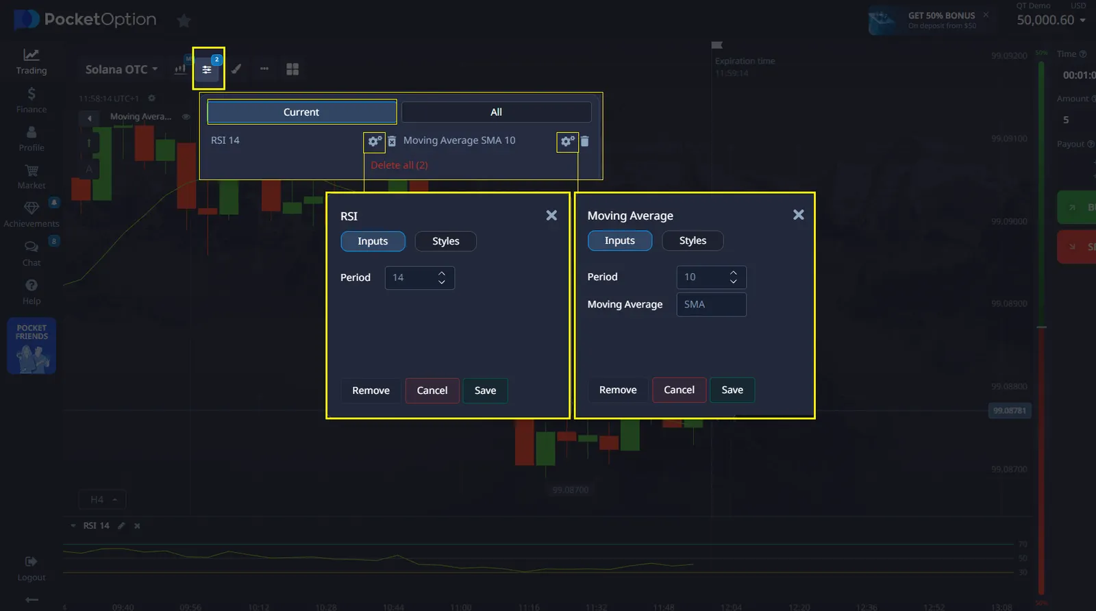 Na plataforma Pocket Option, você pode usar até 30 indicadores em todos os gráficos. Se você atingir esse limite, precisará remover um ou mais indicadores para adicionar um novo.