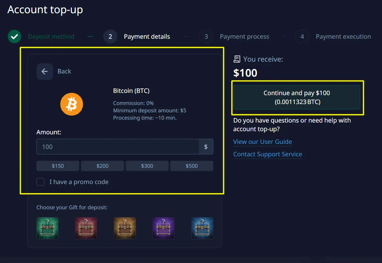 O valor mínimo de depósito começa a partir de $5. No entanto, esse valor pode variar dependendo do seu país. Para verificar o mínimo exato para sua região, selecione Bitcoin como método de pagamento na página de depósito.
