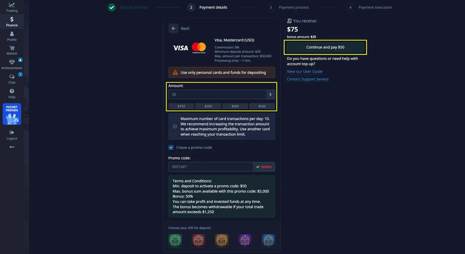 A Pocket Option não cobra taxas para depósitos com cartão de débito, mas seu banco pode aplicar taxas de transação internacional. É melhor verificar com seu banco para obter detalhes.
