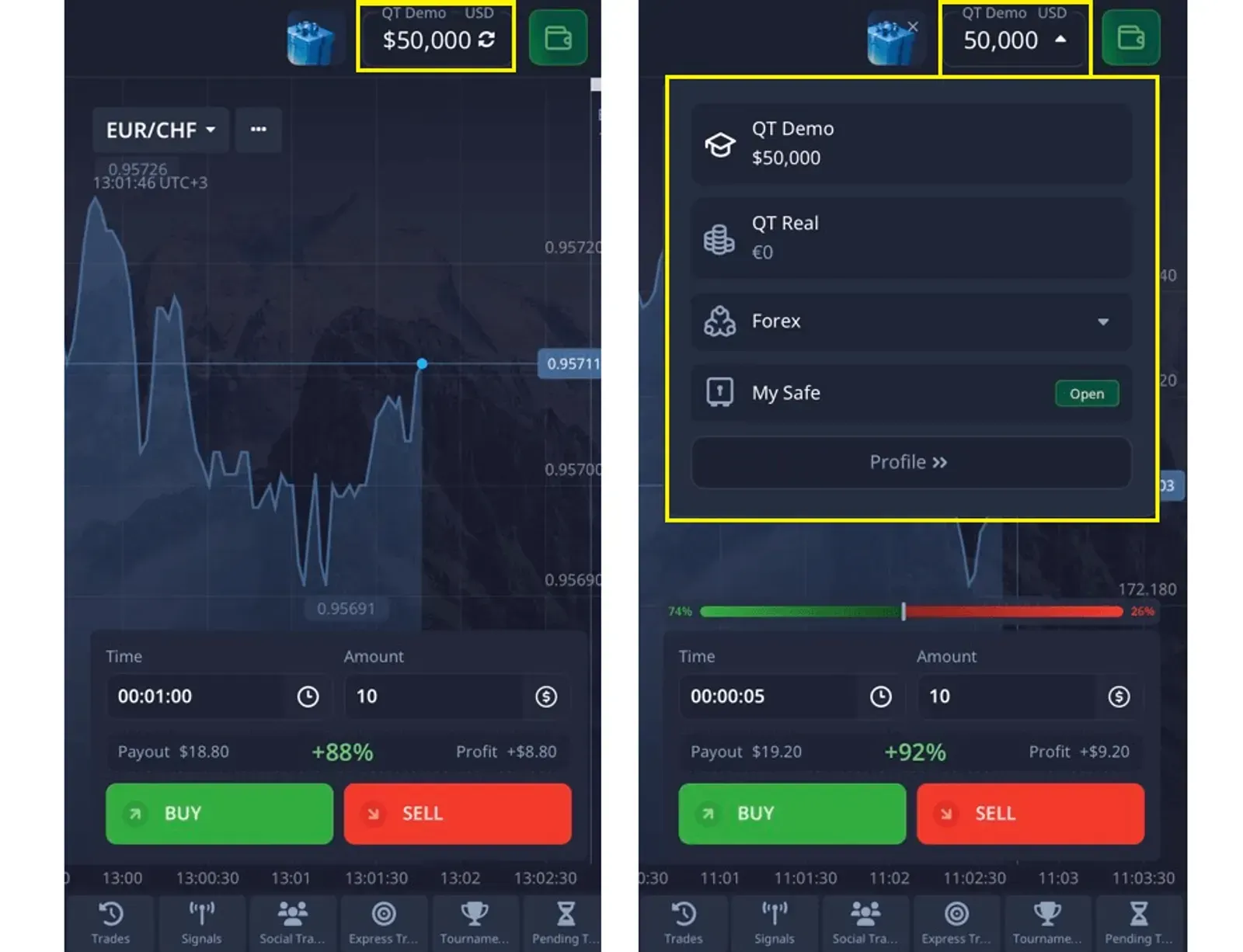 - Ganhe lucro com previsões precisas – Se sua previsão estiver correta, você pode ganhar até 92% de lucro, visível antes de fazer a negociação.