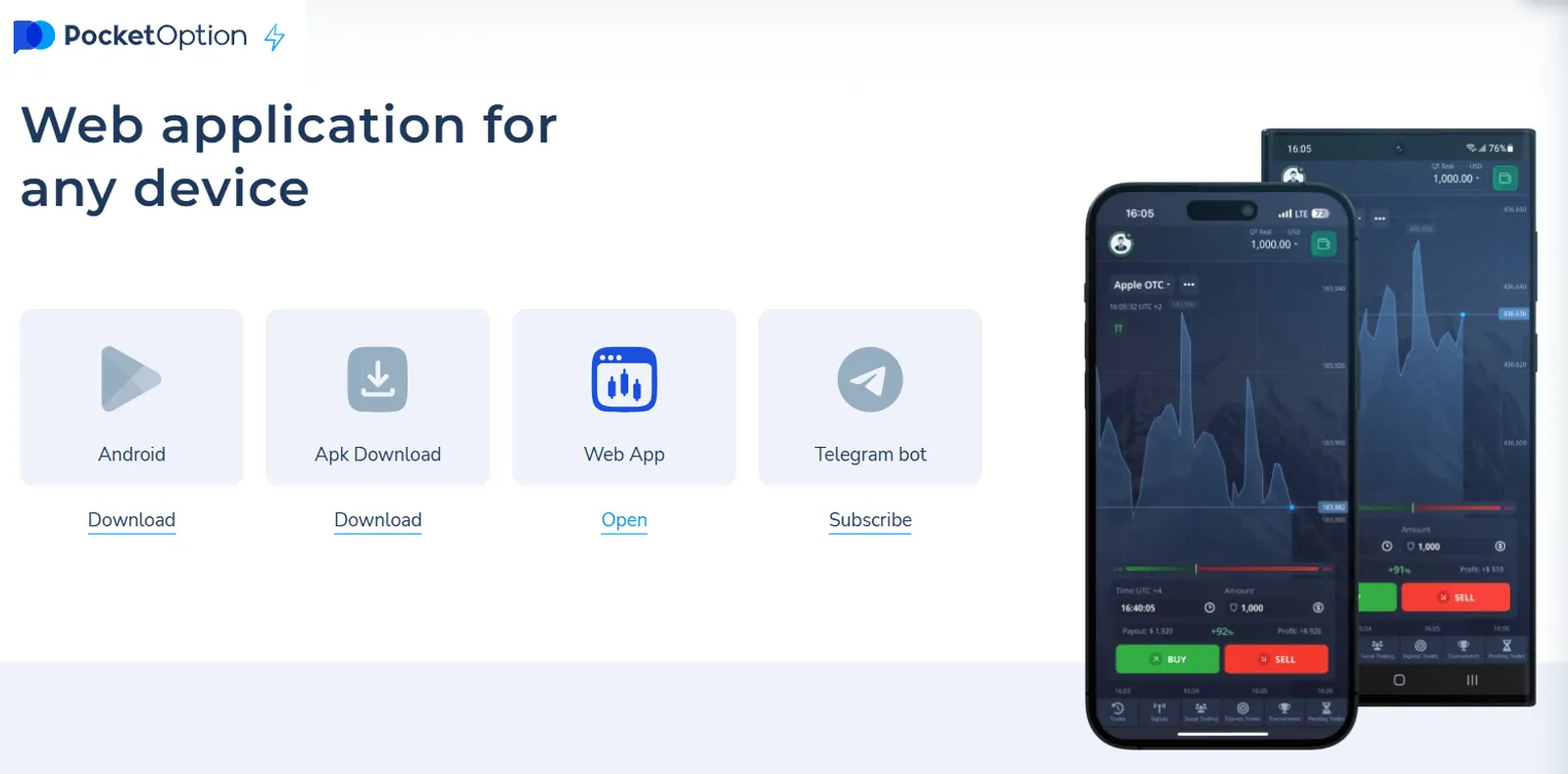 Uma das maiores vantagens do Pocket Option é que você não precisa baixar ou instalar nenhum software para começar a negociar no seu PC com Windows. A plataforma opera diretamente no seu navegador web: