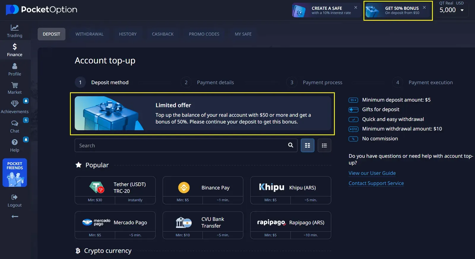 O depósito mínimo necessário para começar a negociar no Pocket Option começa em $5, independentemente do método de pagamento utilizado.
