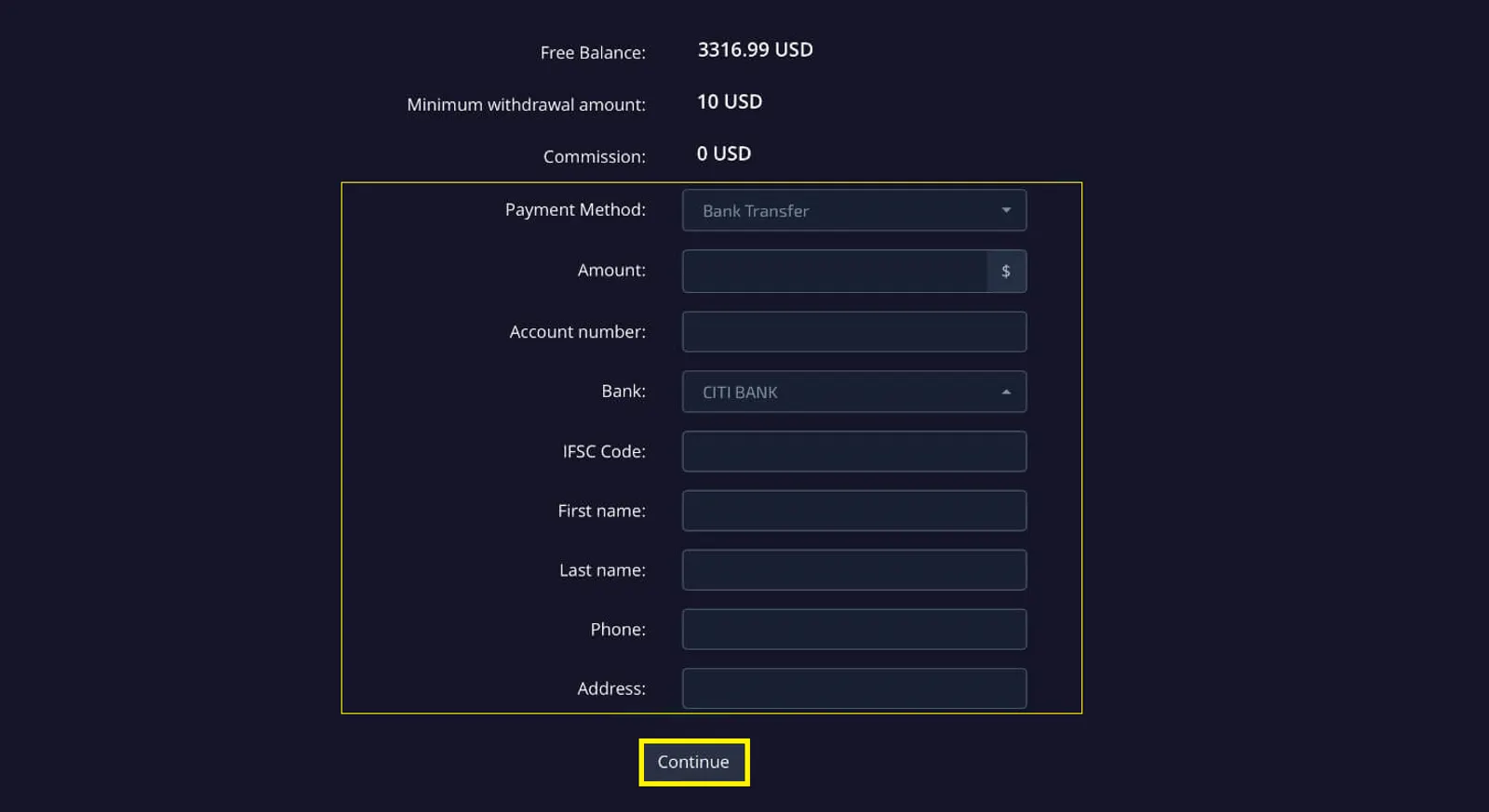 การโอนเงินผ่านธนาคารมักใช้เวลา 1-3 วันทำการในการดำเนินการ อย่างไรก็ตาม ในบางสถานการณ์ เวลาดำเนินการอาจขยายออกไปถึง 14 วันทำการ และคุณจะได้รับแจ้งเกี่ยวกับเรื่องนี้ผ่านทางฝ่ายสนับสนุน จำนวนเงินขั้นต่ำสำหรับการถอนผ่านการโอนเงินผ่านธนาคารจะขึ้นอยู่กับการตั้งค่าของผู้ให้บริการชำระเงินด้วยเช่นกัน เพื่อทราบจำนวนเงินขั้นต่ำที่แน่นอน กรุณาเลือกตัวเลือกการโอนเงินผ่านธนาคารในหน้าการถอนเงินของบัญชีของคุณ ที่นั่นคุณจะเห็นจำนวนเงินขั้นต่ำและสูงสุดที่แสดงอยู่