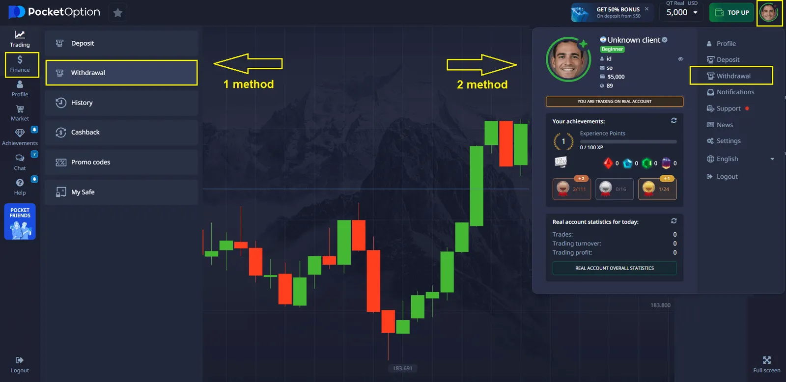 Pocket Option เป็นแพลตฟอร์มการซื้อขายยอดนิยมที่อนุญาตให้ผู้ใช้ซื้อขายไบนารี่ออปชั่นและฟอเร็กซ์ หากคุณทำกำไรและต้องการโอนเงินไปยังบัญชีธนาคารของคุณ กระบวนการนี้ง่ายมาก ในคู่มือนี้ เราจะแนะนำคุณเกี่ยวกับวิธีการถอนเงินจาก Pocket Option ไปยังบัญชีธนาคารอย่างรวดเร็วและปลอดภัย