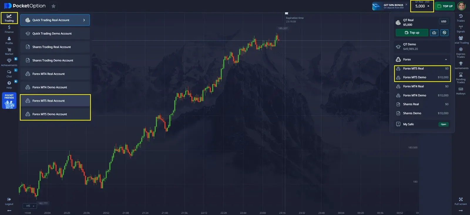 ใช้ประโยชน์จาก MT5 บนแพลตฟอร์ม Pocket Options! เพียงเลือกประเภทแพลตฟอร์มนี้ในการตั้งค่าและเริ่มเทรด!
