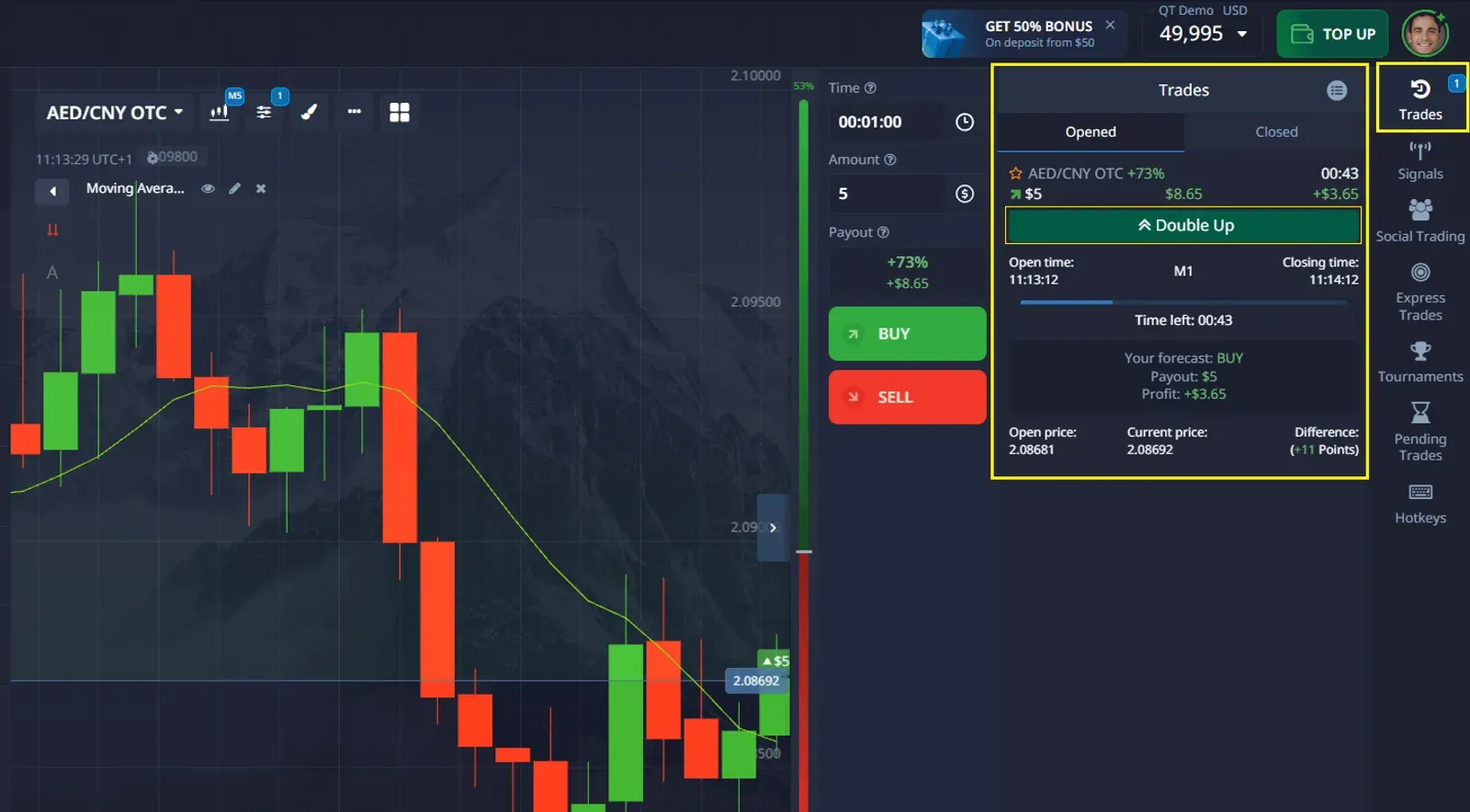 เมื่อคุณรู้สึกมั่นใจว่าแนวโน้มจะยังคงดำเนินต่อไป คุณสามารถใช้คุณสมบัติ Double Up เพื่อวางคำสั่งซื้อที่ซ้ำกันอย่างรวดเร็วด้วยราคาและเวลาหมดอายุเดียวกันกับรายการแรก สิ่งนี้มีประสิทธิภาพเป็นพิเศษเมื่อเทรดสินทรัพย์อย่าง Bitcoin ซึ่งแนวโน้มราคาอาจแข็งแกร่งและคงอยู่
