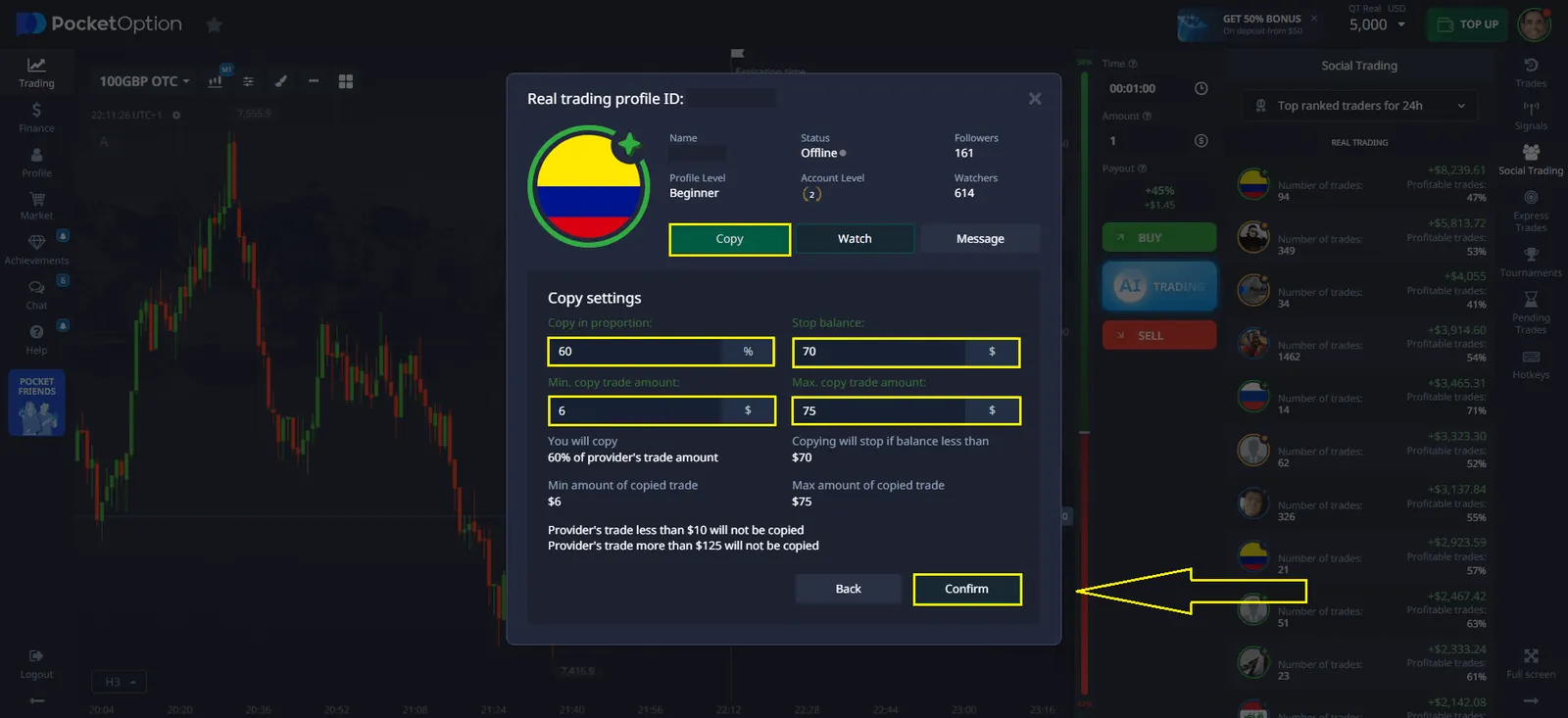 Pocket Option, süreci her deneyim seviyesindeki kullanıcılar için erişilebilir ve verimli kılmak üzere tasarlanmış bir dizi özellik sunarak, otomatik sosyal ticaret için önde gelen bir platform olarak kendini kanıtlamıştır.