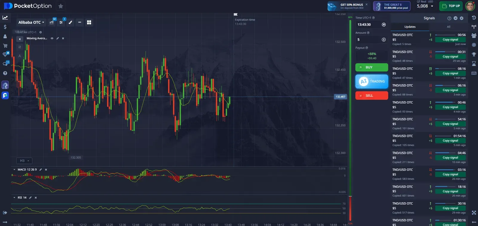 Sadece kaydolun, bir demo açın ve mevcut göstergeleri keşfedin. İlk para yatırma işleminizden sonra "50START" promosyon kodunu kullanın.