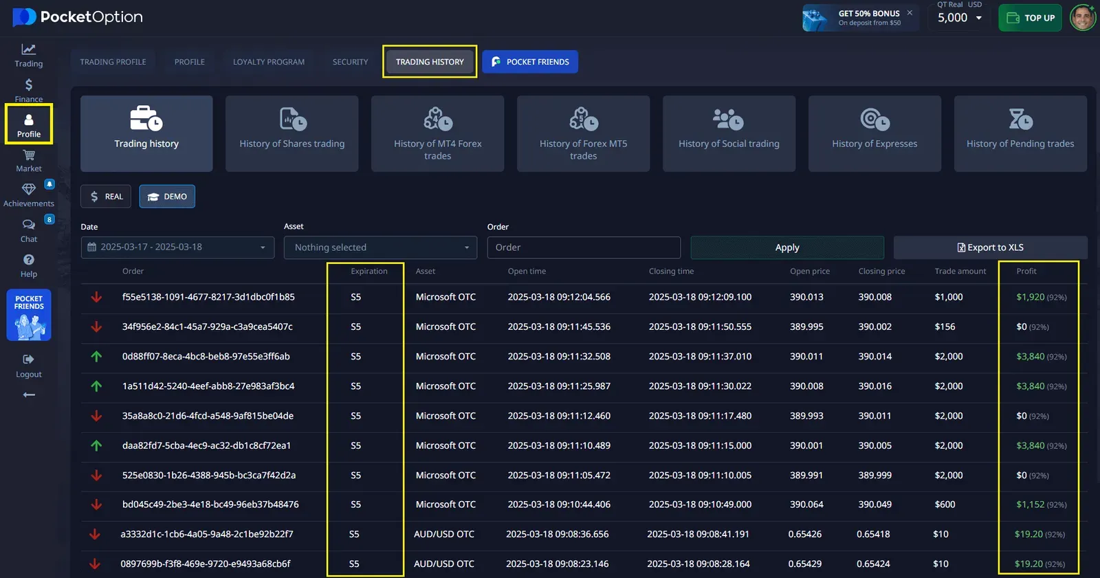 Pocket Option, trading equity eğrinizin oluşturulmasında önemli rol oynayan özel bir “Trades” bölümü sunar. Kârlar, zararlar ve genel performans dahil işlem geçmişinizi analiz ederek, trading hesabınızın zaman içindeki büyümesini veya düşüşünü izleyebilirsiniz. Bu detaylı kayıtlar, trading etkinliğinizin verimliliğini görselleştirmenize ve stratejilerinizi geliştirmek için bilinçli kararlar almanıza olanak tanır.