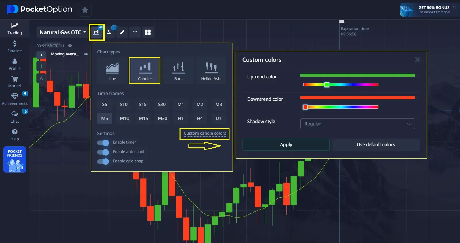 Q: Pocket Option’da candlestick grafikleri nasıl ayarlanır?