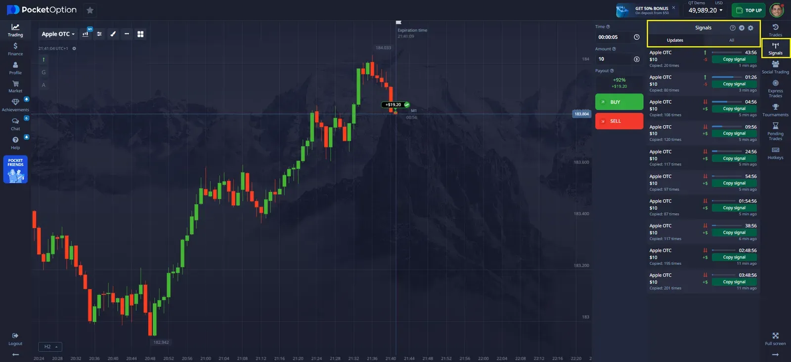 Pocket Option, Türk yatırımcılar için modern ticaretin ihtiyaç duyduğu gelişmiş sinyal altyapısını sunar. 100’den fazla varlık için gerçek zamanlı, otomatik sinyaller sağlar. Bu sinyaller, kullanıcıların tanımladığı kurallara ulaşıldığında uyarılar göndererek işlem fırsatlarını bildirir. Özellikle algoritmaların sürekli optimizasyonu sayesinde %90’ın üzerinde doğruluk oranlarıyla çalışır.