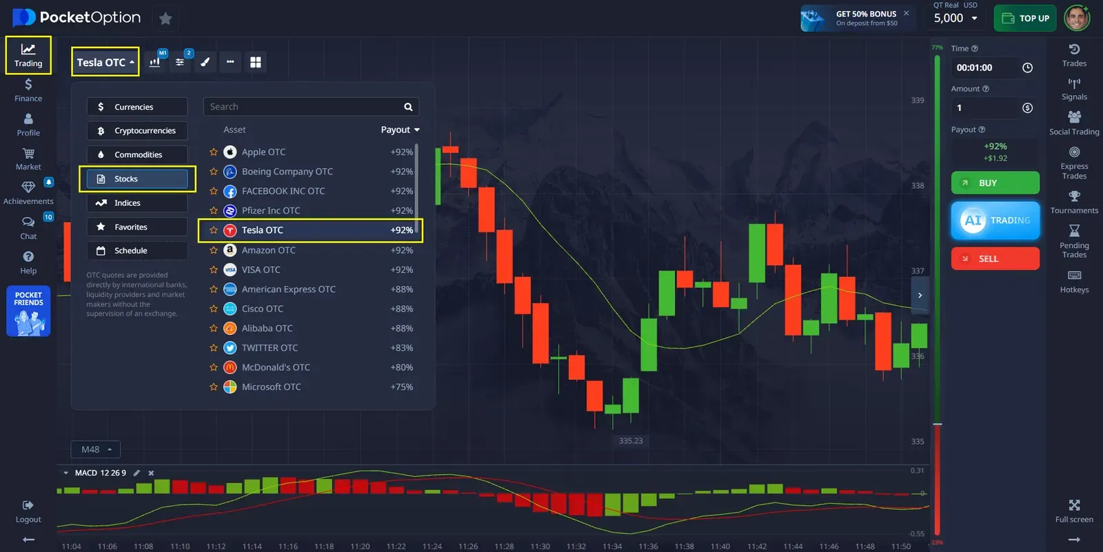 Khi xem xét làm thế nào tôi có thể mua cổ phiếu Tesla, việc chọn một môi giới phù hợp với mục tiêu đầu tư của bạn và cung cấp phí cạnh tranh là rất quan trọng. Pocket Option là một nền tảng cung cấp giao diện thân thiện với người dùng cho giao dịch cổ phiếu, bao gồm cả cổ phiếu Tesla.