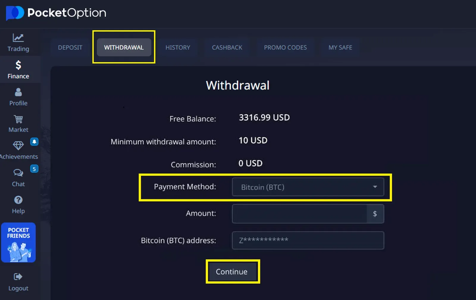 Đối với rút tiền điện tử, Pocket Option cung cấp nhiều lựa chọn, bao gồm Bitcoin và các loại tiền điện tử chính khác. Sự linh hoạt này cho phép bạn chọn phương thức phù hợp nhất với sở thích và nhu cầu của bạn.