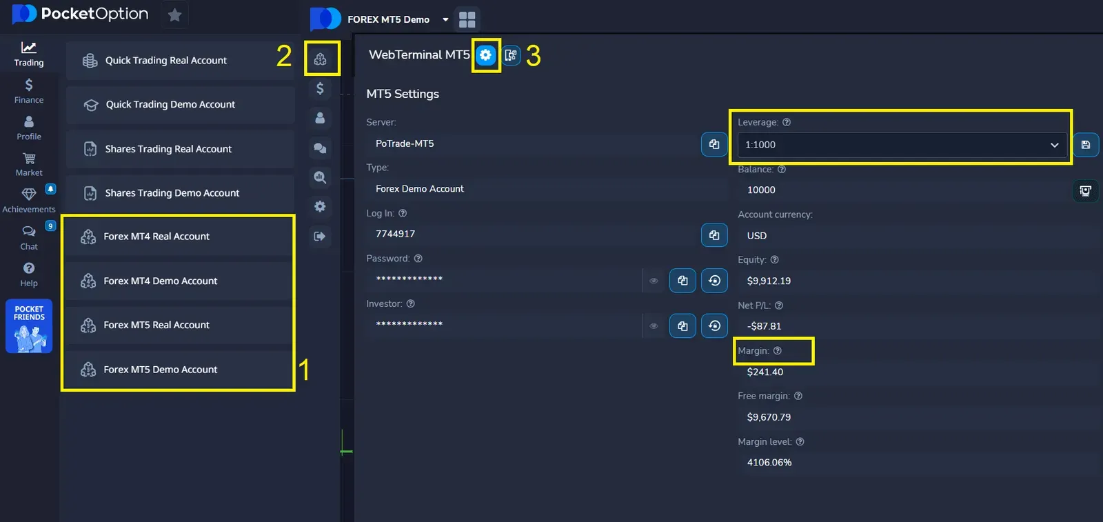 - Đối với các nhà giao dịch tìm kiếm đòn bẩy cao, Pocket Option nổi bật với đòn bẩy 1:1000 thông qua các nền tảng MetaTrader 4 (MT4) và MetaTrader 5 (MT5).