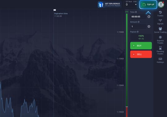 Successivamente, ti troverai sul grafico attuale dell'asset scelto. Inoltre, aggiungi gli indicatori richiesti al grafico, abilita segnali e disegni per aiutare l'analisi tecnica del mercato. Fai la tua previsione ed effettua l'ordine utilizzando il pannello di trading. Puoi sempre tracciare e monitorare la tua sessione di trading nel menu Trade.